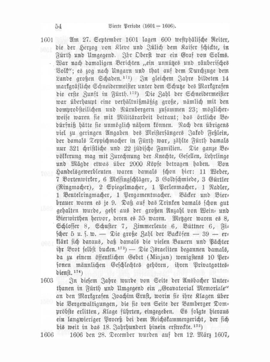 Den 31. März 1611 wurde Josef Hezech, Jude aus Posen 1611 und ehemaliger Lehrer zu Fürth, von den Geistlichen in Nürnberg auf den christlichen Glauben examinirt und sodann in Altorf getauft. Er erhielt den Namen Paulus Josef. Später wurde er blind, zog nach Bamberg und wurde dort katholisch, schrieb dann von Wien aus gegen Nürnberg und starb im Elend.179) — In gleichem Jahre den 6. Juli wurde der domprobsteiliche Amtsknecht, der den Geleits-Amtsknecht mißhandelt hatte, nach Cadolzburg in Verhaft gebracht, später auch der domprobsteiliche Amtmann selbst.180)