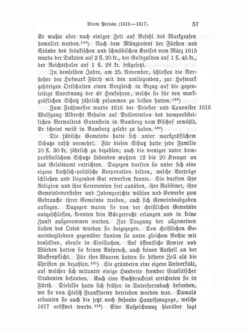 1617 Folgendes: „Sonntag Lätare den 23. Februar 1617 haben die Juden zu Fürth, deren allda viel sind, ihre Synagoge, welche sie uff des Herrn Joachim Ernst, Markgraffen zu BrandenburgAnspach erlaubnuß uff desselbigen Grund und Boden, welchen sie wol theuer bezalen müßen, allda zu Fürth mit großen Un kosten von neuem erbaut, erstemals betzogen und eingeweihet, dahin eine große menge Volks von Alten und Jungen von Christlichen mannen und Frawen zusammenkommen, welche gesehen und ge höret, wie immer ein Jüdischer Rabbi dem andern nach uff die Cantzel gestiegen, und nach ihrer Weise und ihrer Ebreische Sprach gebettet.""?) Bald nachher stiftete die Familie Gumberts den kostbaren Vorhang, welcher die zehen Gebote verhüllt und den Ueberzug über die Gesetzesrolle. Der Vorsänger Elkana hatte beide mit großem Fleiß für die israelitische Gemeinde in Amsterdam verfertigt. Als letztere sie als zu kostbar zurück geschickt, kauften sie die Gumberts um 1200 st. und stifteten sie in die Synagoge.'") Auch verehrte der Rabbi Henoch Levi aus Wien als Beweis seiner Dankbarkeit für erhaltene Schutz aufnahme ein schön geschriebenes Zehngebot. Endlich stiftete die Familie Fränkel von Wien aus gleichem Motive einen schönen messingenen Leuchter, worin das ewige Licht brannte."») Neben dem jüdischen Spital, in welchem die Kranken und Kind betterinnen auf Gemeindekosten durch dazu gewählte Pfleger und einen jüdischen Arzt verpflegt wurden, lag der Anfangs kleine Friedhof, der aber am 27. Juli 1617 durch den Ankauf des Schindangerplatzes von des Wasenmeisters Hans Lehmanns Wittwe um 305 Gulden und 5 Thaler Leikauf, später eines Grundstückes, das dem Bierbrauer Singer gehörte, vergrößert wurde."«) Die Kranken, welche im jüdischen Spital behandelt wurden, find theilweise auf Kosten der Gemeinde, die für War ten und Pflege eines Kranken wöchentlich 1 fl. 30 kr. bezahlte, theilweise auf Kosten der jüdischen Hausväter verpflegt worden. Für dieselben war außer dem Wartepersonal ein jüdischer Arzt, ein christlicher Wundarzt und eine jüdische Hebamme angestellt.