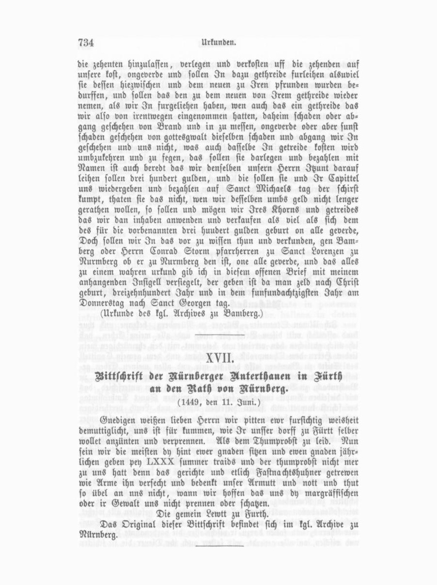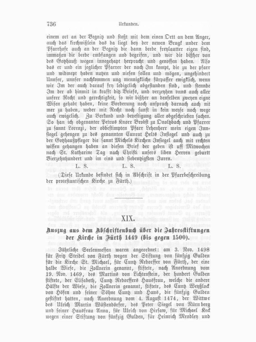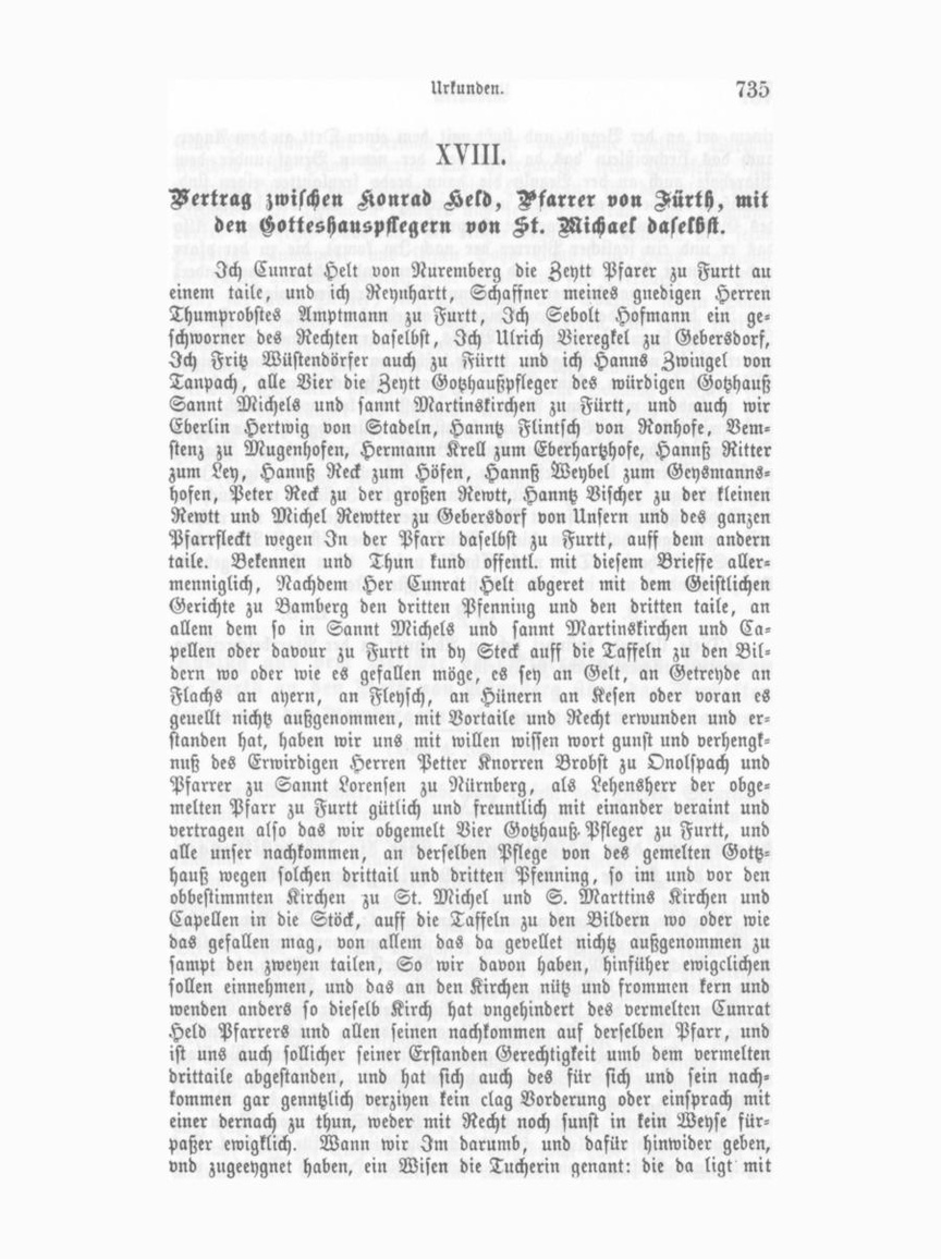 Vertrag zwischen Konrad Keld, Vkarrer von Aürth, mit den Hotteshauspflegern von St. Michael dasetbk. Ich Cunrat Helt von Nuremberg die Zeytt Pfarer zu Furtt au einem taile, und ich Reynhartt, Schaffner meines gnedigen Herren Thumprobstes Amptmann zu Furtt, Ich Sebolt Hofmann ein geschworner des Rechten daselbst, Ich Ulrich Vieregkel zu Gebersdorf, Ich Fritz Wüstendörfer auch zu Fürtt und ich Hanns Zwingel von Tanpach, alle Vier die Zeytt Gotzhaußpfleger des würdigen Gohhauß Sannt Michels und sannt Martinskirchen zu Fürtt, und auch wir Eberlin Hertwig von Stadeln, Hanntz Flintsch von Ronhofe, Vemstenz zu Mugenhofen, Hermann Krell zum Eberhartzhofe, Hannß Ritter zum Ley, Hannß Reck zum Höfen, Hannß Weybel zum Geysmanns hofen, Peter Reck zu der großen Rewtt, Hanntz Vischer zu der kleinen Rewtt und Michel Rewtter zu Gebersdorf von Unsern und des ganzen Pfarrfleckt wegen In der Pfarr daselbst zu Furtt, auff dem andern taile. Bekennen und Thun kund offentl. mit diesem Brieffe allermenniglich, Nachdem Her Cunrat Helt abgeret mit dem Geistlichen Gerichte zu Bamberg den dritten Pfenning und den dritten taile, an allem dem so in Sannt Michels und sannt Martinskirchen und Ca pellen oder davour zu Furtt in dy Steck auff die Taffeln zu den Bil dern wo oder wie es gefallen möge, es sey an Gelt, an Getreyde an Flachs an ayern, an Fleysch, an Hünern an Kesen oder voran es geuellt nichtz außgenommen, mit Vortaile und Recht erwunden und er standen hat, haben wir uns mit willen wissen wort gunst und verhengknuß des Erwirdigen Herren Petter Knorren Brobst zu Onolspach und Pfarrer zu Sannt Lorensen zu Nürnberg, als Lehensherr der obgemelten Pfarr zu Furtt gütlich und freundlich mit einander veraint und vertragen also das wir obgemelt Vier Gotzhauß. Pfleger zu Furtt, und alle unser nachkommen, an derselben Pflege von des gemelten Gottzhauß wegen solchen drittail und dritten Pfenning, so im und vor den obbestimmten Kirchen zu St. Michel und S. Marttins Kirchen und Capellen in die Stöck, auff die Taffeln zu den Bildern wo oder wie das gefallen mag, von allem das da gevellet nichtz außgenommen zu sampt den zweyen tailen, So wir davon haben, hinfüher ewigclichen sollen einnehmen, und das an den Kirchen nütz und frommen kern und wenden anders so dieselb Kirch hat ungehindert des vermelten Cunrat Held Pfarrers und allen seinen nachkommen auf derselben Pfarr, und ist uns auch sollicher seiner Erstanden Gerechtigkeit umb dem vermelten drittaile abgestanden, und hat sich auch des für sich und sein nach kommen gar genntzlich verziyen kein clag Vorderung oder einsprach mit einer dernach zu thun, weder mit Recht noch sunst in kein Weyse fürpaßer ewigklich. Wann wir Im darumb, und dafür Hinwider geben, vnd zugeeygnet haben, ein Wisen die Tucherin genant: die da ligt mit