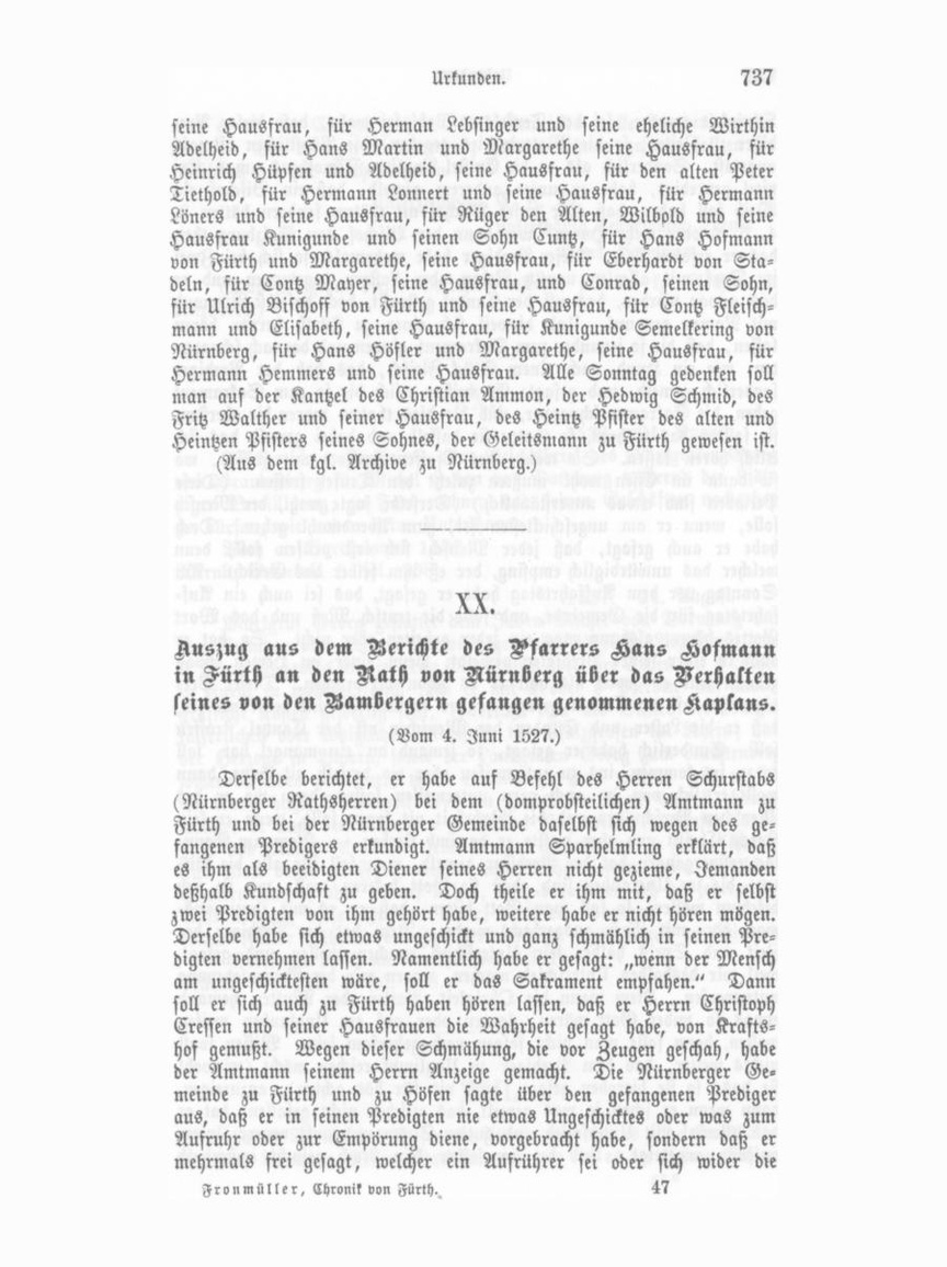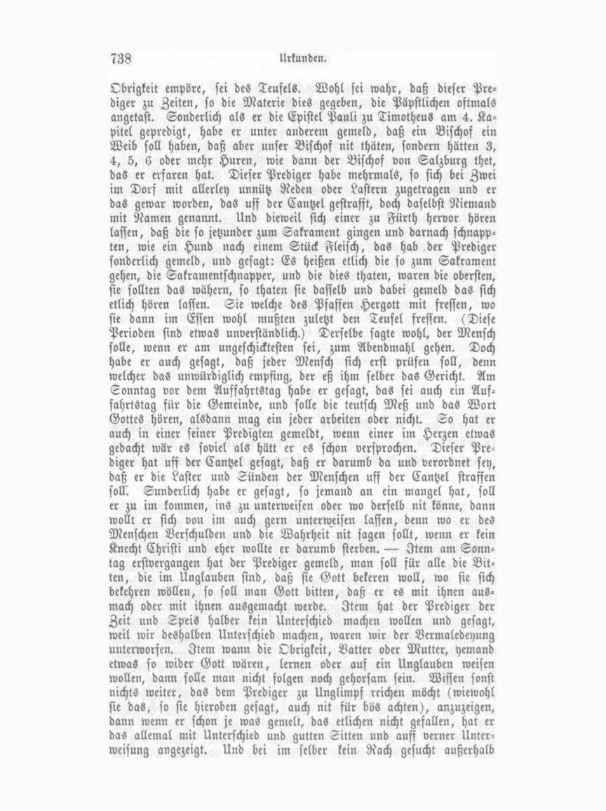 Obrigkeit empöre, sei des Teufels. Wohl sei wahr, daß dieser Pre diger zu Zeiten, so die Materie dies gegeben, die Päpstlichen oftmals angetast. Sonderlich als er die Epistel Pauli zu Timotheus am 4. Ka pitel gepredigt, habe er unter anderem gemeld, daß ein Bischof ein Weib soll haben, daß aber unser Bischof nit thäten, sondern hätten 3, 4, 5, 6 oder mehr Huren, wie dann der Bischof von Salzburg thet, das er erfaren hat. Dieser Prediger habe mehrmals, so sich bei Zwei im Dorf mit allerley unnütz Reden oder Lastern zugetragen und er das gewar worden, das uff der Cantzel gestrafft, doch daselbst Niemand mit Namen genannt. Und dieweil sich einer zu Fürth hervor hören lassen, daß die so jetzunder zum Sakrament gingen und darnach schnapp ten, wie ein Hund nach einem Stück Fleisch, das hab der Prediger sonderlich gemeld, und gesagt: Es heißen etlich die so zum Sakrament gehen, die Sakramentschnapper, und die dies thaten, waren die obersten, sie sollten das wähern, so thaten sie dasselb und dabei gemeld das sich etlich hören lassen. Sie welche des Pfaffen Hergott mit fressen, wo sie dann im Essen wohl mußten zuletzt den Teufel fressen. (Diese Perioden sind etwas unverständlich.) Derselbe sagte wohl, der Mensch solle, wenn er am ungeschicktesten sei, zum Abendmahl gehen. Doch habe er auch gesagt, daß jeder Mensch sich erst prüfen soll, denn welcher das unwürdiglich empfing, der eß ihm selber das Gericht. Am Sonntag vor dem Auffahrtstag habe er gesagt, das sei auch ein Auf fahrtstag für die Gemeinde, und solle die teutsch Meß und das Wort Gottes hören, alsdann mag ein jeder arbeiten oder nicht. So hat er auch in einer seiner Predigten gemeldt, wenn einer im Herzen etwas gedacht wär es soviel als hätt er es schon versprochen. Dieser Pre diger hat uff der Cantzel gesagt, daß er darumb da und verordnet sey, daß er die Laster und Sünden der Menschen uff der Cantzel straffen soll^ Sunderlich habe er gesagt, so jemand an ein mangel hat, soll er zu im kommen, ins zu unterweisen oder wo derselb nit könne, dann wollt er sich von im auch gern unterweisen lasten, denn wo er des Menschen Verschulden und die Wahrheit nit sagen sollt, wenn er kein Knecht Christi und eher wollte er darumb sterben. — Item am Sonn tag erstvergangen hat der Prediger gemeld, man soll für alle die Bit ten, die im Unglauben sind, daß sie Gott bekeren woll, wo sie sich bekehren wöllen, so soll man Gott bitten, daß er es mit ihnen aus mach oder mit ihnen ausgemacht werde. Item hat der Prediger der Zeit und Speis halber kein Unterschied machen wollen und gesagt, weil wir deshalben Unterschied machen, waren wir der Vermaledeyung unterworfen. Item wann die Obrigkeit, Vatter oder Mutter, yemand etwas so wider Gott wären, lernen oder auf ein Unglauben weisen wollen, dann solle man nicht folgen noch gehorsam sein. Misten sonst nichts weiter, das dem Prediger zu Unglimpf reichen möcht (wiewohl sie das, so sie hieroben gesagt, auch nit für bös achten), anzuzeigen, dann wenn er schon je was gemelt, das etlichen nicht gefallen, hat er das allemal mit Unterschied und gutten Sitten und aufs verner Unter weisung angezeigt. Und bei im selber kein Rach gesucht außerhalb