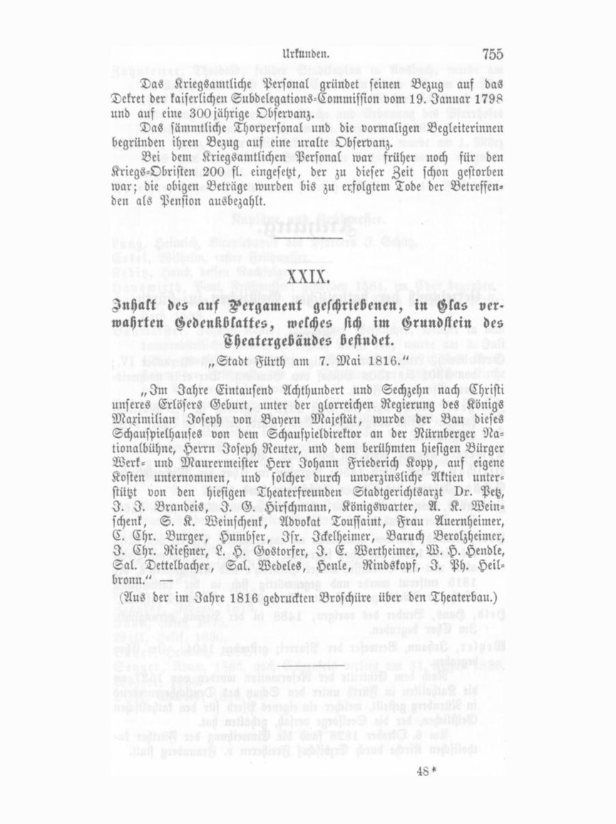 „Im Jahre Eintausend Achthundert und Sechzehn nach Christi unseres Erlösers Geburt, unter der glorreichen Regierung des Königs Maximilian Joseph von Bayern Majestät, wurde der Bau dieses Schauspielhauses von dem Schauspieldirektor an der Nürnberger Na tionalbühne, Herrn Joseph Reuter, und dem berühmten hiesigen Bürger Werk- und Maurermeister Herr Johann Friederich Kopp, auf eigene Kosten unternommen, und solcher durch unverzinsliche Aktien unter stützt von den hiesigen Theaterfreunden Stadtgerichtsarzt vr. Petz, I. I. Brandeis, I. G. Hirschmann, Königswarter, A. K. Wein schenk, S. K. Weinschenk, Advokat Toussaint, Frau Auernheimer, C. Chr. Burger, Humbser, Jsr. Jckelheimer, Baruch Berolzheimer, I. Chr. Nießner, L. H. Gostorfer, I. E. Wertheimer, W. H. Hendle, Sal. Dettelbacher, Sal. Wedeles, Henle, Rindskopf, I. PH. Heil bronn." — (Aus der im Jahre 1816 gedruckten Broschüre über den Theaterbau.)