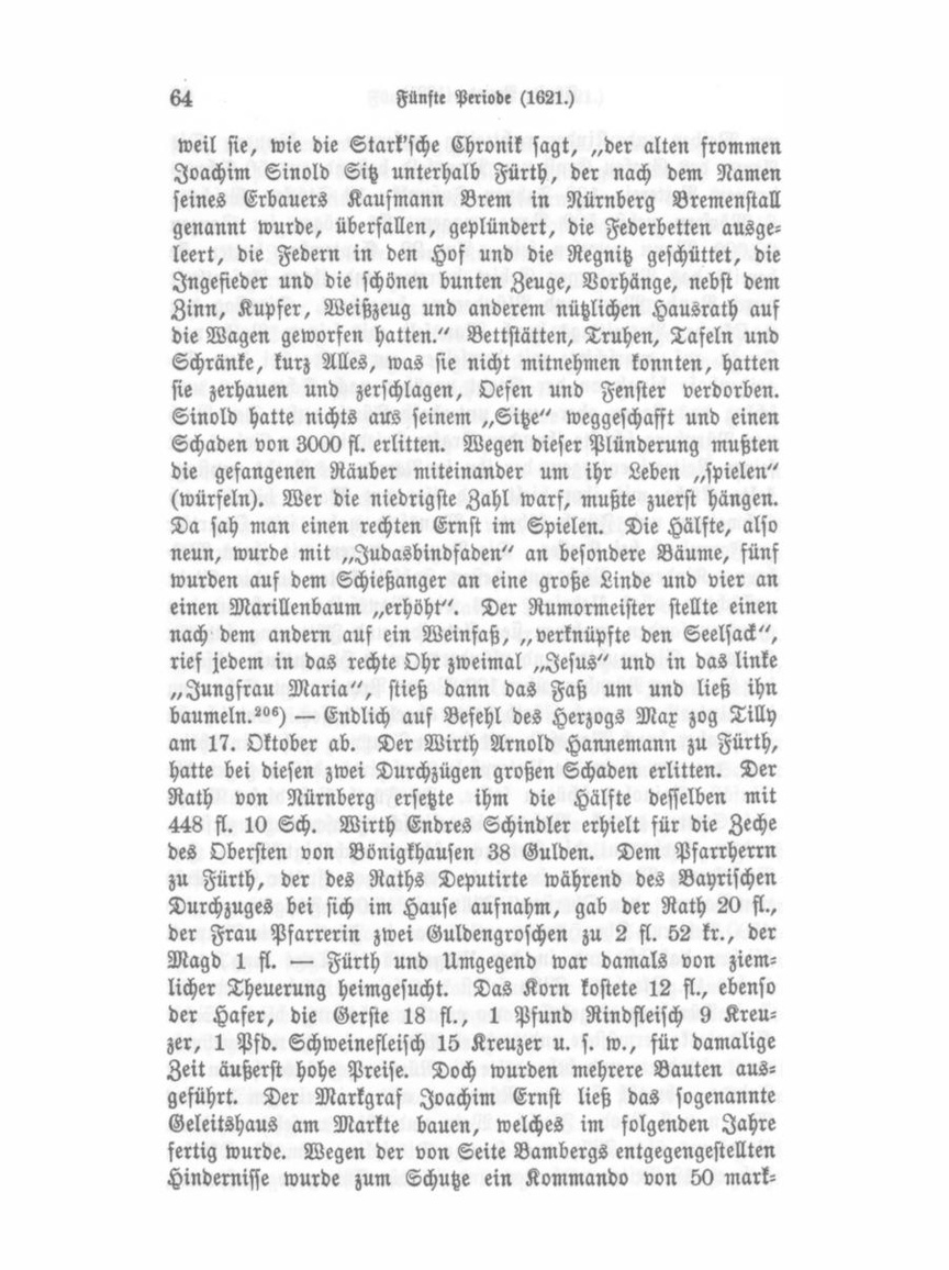 Fässer aus der Kirche zu Fürth nach Nürnberg wälzen, wofür er einem Taglöhner einen Gulden und einen Ort gab. Der Christ mußte dem Bauern für jedes Pferd, welches er einspannte, 1 Reichsthaler zahlen, ein Jude aber mußte für eine vierspännige Fuhre von Fürth bis Cadolzburg 6 Reichsthaler geben. Das Flüchten dauerte bis Donnerstag den 10. Vormittags; trotzdem hatte die halbe Gemeinde von Fürth noch ihr Eigenthum in der Kirche. An genanntem Tage und zur genannten Stunde kam ein Mönch in einer grauen Kutte nach Fürth geritten. Er hielt in seiner Rechten eine Wachskerze und ließ sich den Weg nach dem Pfarrhofe zeigen. Als er eben in den Kirchhof sprengte, wollte er wissen, was man in der Kirche thue. Als nun die Leute erwiderten, man schaffe heraus, was man hineingetragen, schrie er, man solle zusperren; es solle ihnen nichts daraus weg genommen werden. Dann ritt der Mönch zum Pfarrhaus, schrieb ein S. X. hin und zeichnete einen Galgen daneben, an Fronmüller, Chronik von Fürth.