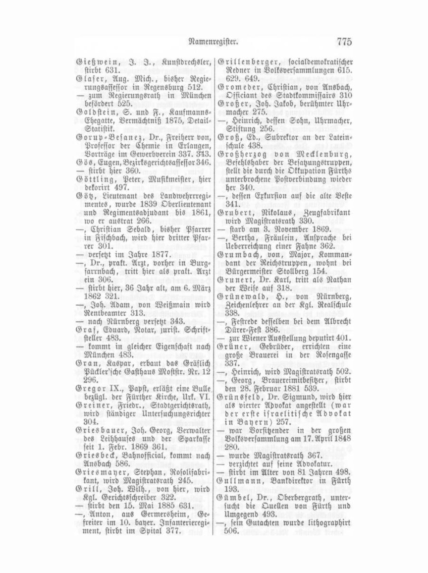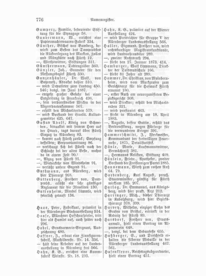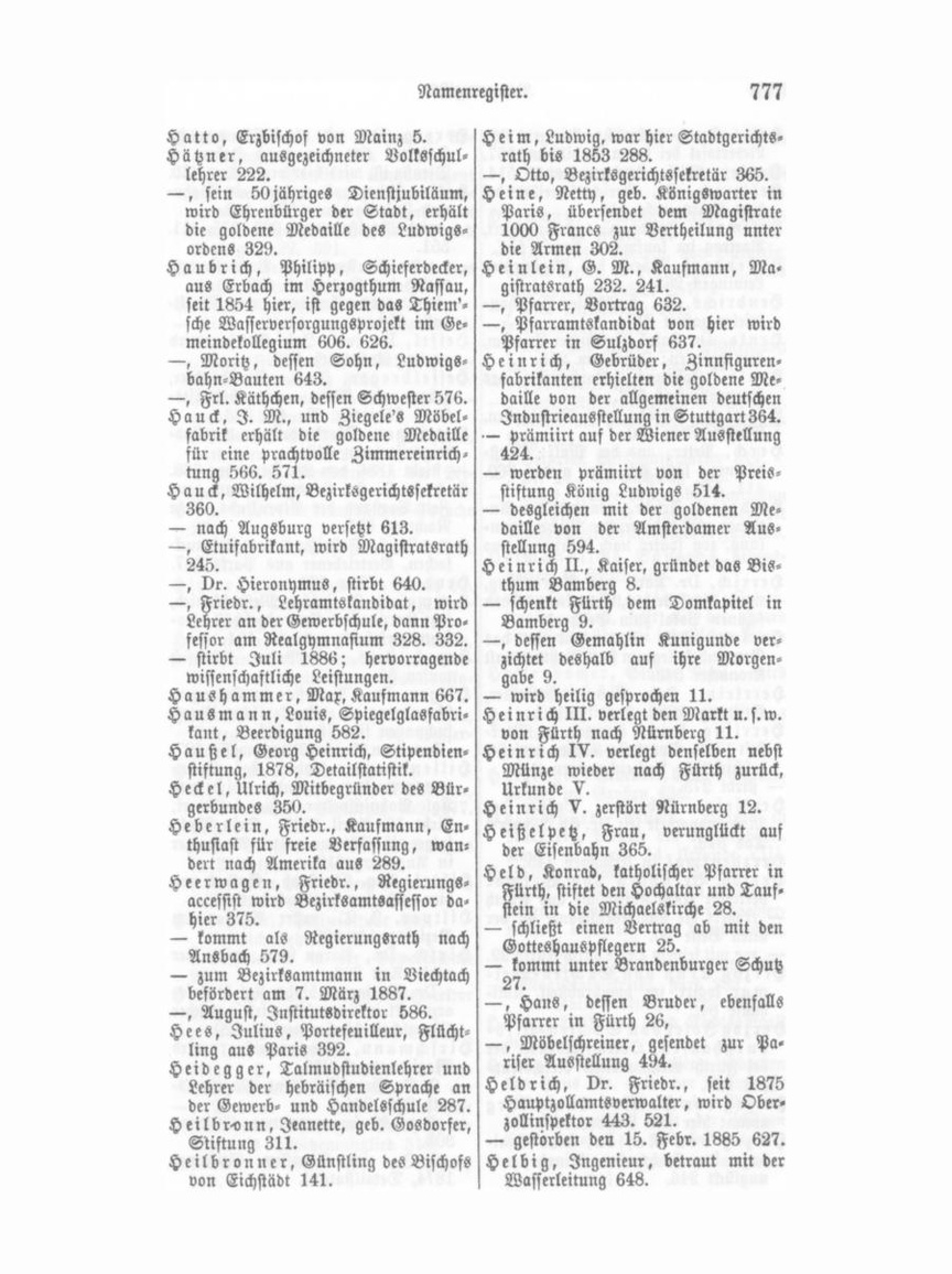 Gumperz, Familie, bedeutende Stif Hahn, K. G., prämiirt auf der Wiener tung für die Synagoge 58. Ausstellung 424. Gundermann, W., errichtet eine — wird Preisrichter für Gruppe V der Papiermacheewaaren-Fabrik 334. Nürnberger Landesausstellung 566. Günther, Bischof von Bamberg, be Haller, Sigmund, Freiherr von, wird wirkt zum Besten des Domprobstes rechtSkunstiger Magistratsfunktionär, die Rückverlegung des Marktes, Zolles wird Landwehrauditor 289. und Münzstätte nach Fürth 12. — , zweiter Rechtsrath 294. — , Wirthswittwe, Stiftungen 311. — stirbt den 27. Januar 1873. 414. Günthermann, Todtengrüber 360. Hamburger, Wolf Lippmann, Direk Günzler, Joh., Geometer für den tor der Taldmudschule 166. Messungsbezirk Fürth 330. — stirbt 81 Jahre alt 289. Gunzenhäuser, Dr. Wolf, von Hammer, Di-. Christian, von Mainbern Bayreuth, Advokat dahier 310. heim, wird vom Markgrafen zum — wird Deputirter zum Landtag 450. Gerichtsarzt für die Hofmark Fürth 546; desgl. im Juni 1887. ernannt 180. — entgeht großer Gefahr bei einer — , erster Rath am neuorganisirten Be Entgleisung in Frankreich 498. zirksgericht 308. — , sein verdienstvolles Wirken in der — wird Direktor; erhält den Michaels Abgeordnetenkammer 507. orben 321. — erhält den Michaelsorden 579. — wird pensionirt 463. — wird Vorstand der israelit. Kultus — stirbt in Nürnberg am 18. April gemeinde 625. 647. 1883. Gustav Adolf, König von Schwe — , Auguste, dessen Gattin, erhält das den , bivuakirt mit seinem Heer auf Verdlenstkreuz, wegen Fürsorge für der Haard, tags darauf über Fürth die verwundeten Krieger 391. Einzug in Nürnberg 83. Hammerschmidt, I., Werkmeister, - - kommt nach Fürth zurück; Empfang Kommandant der freiwilligen Feuer desselben; Verproviantirung 86. wehr, 1875, Detailstatistik. — verschanzt sich bei Fürth nach der Hänle, Marie, Kaufmannswittwe, Vermächtnis; 381. Schlacht bei der alten Veste, wohnt da in einem Zelt 90.' — , Hermanns Relikten, Stiftung 409. Hänlein, Friedr., Apotheker, zweiter — , Abzug von Fürth 91. . Vorstand der Freisinnigen Partei 1885. — , Wiederkehr von Windsheim 91. Hannemann, Wirth zum rothen Roß — verläßt unsere Gegend 91. 64. 79. Guthmann, aus Nürnberg, wird Hardenberg, Karl August, preuß. hier Thierarzt 268. Staatsminister, günstig für Fürth Guttenberg, Freiherr von, Dom wirksam 185. 207. probst, erläßt ein sehr günstiges Harlog, Dr. Emmanuel, aus Königs Reglement für die Israeliten 130. berg, wird hier prakt. Arzt 212. Gutten he im, Mendel Lämmle, wird Harringer, Mich., bisher Thierarzt feierlich getauft 134. in Kadolzburg, wird hier Bezirks thierarzt 378. 399. Haas, Peter, Fabrikant, prämiirt in Harvey, Wilhelm, einziger Sohn des Grafen von Bristol, ertrinkt in der der Nürnberger Blechausstellung 514. Rednitz bei Fürth 89. Haase, Münchner Hofschauspieler, tritt hier als Hamlet auf, auch später noch Harsdorf, Freiherr von, Staats anwalt, hielt einen Vortrag im Al 296. penverein 648. Habel, Gensdarmerie-Sergeant, Aus — , desgl. bei dem Sedanfeste 655. zeichnung 480. Haffner, I., erbaut eine Zinnfiguren Haßberger, S., und Dreschfeld er halten die silberne Medaille in der fabrik, Mathildenstt. Nr. 14. 336. Nürnberger Landesausstellung 467. — hält seine Arbeiter auf der Landes 561. ausstellung in Nürnberg frei 566. Hahn, K. G., errichtet eine Kamm Hasenklever, Reichstagsabgeordneter, hielt einen Vortrag 451. fabrik Weinstr. Nr. 18. 293.