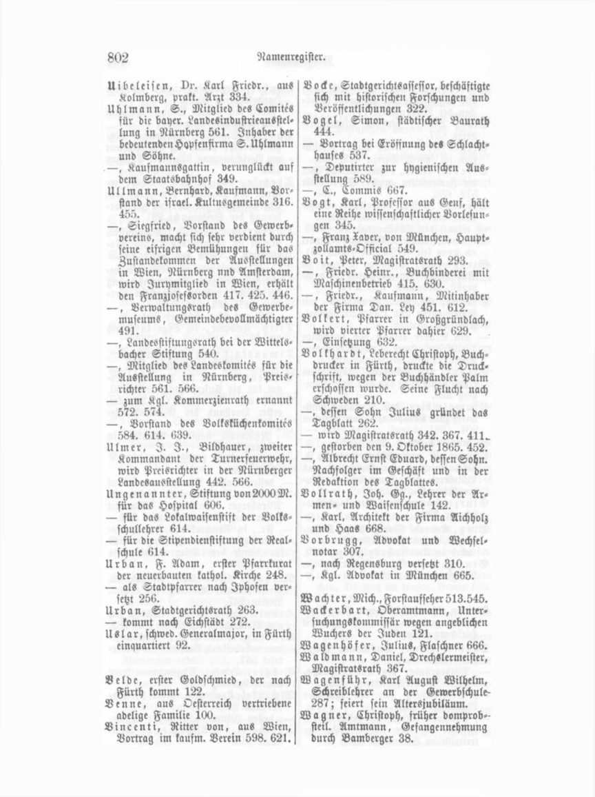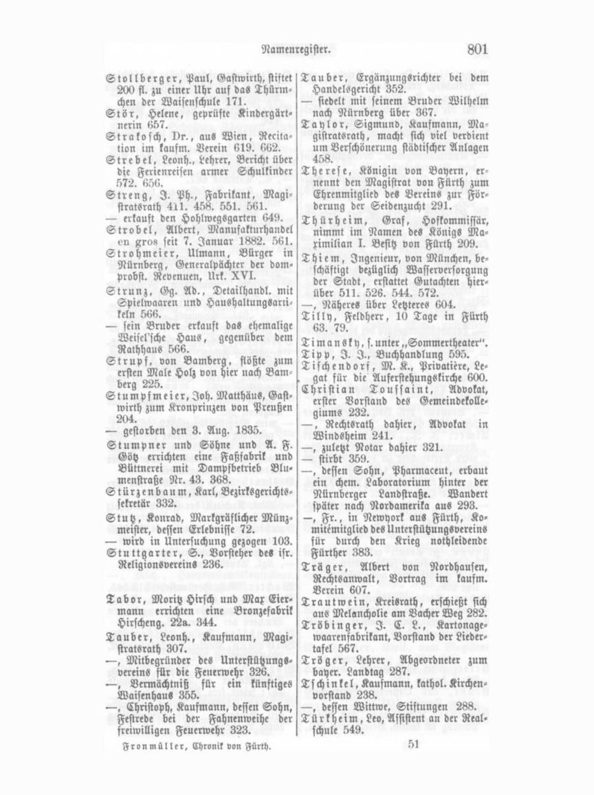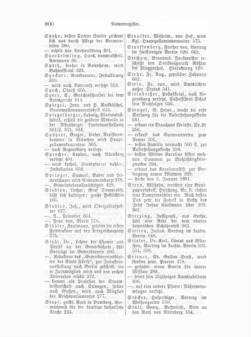 Stollberger, Paul, Gastwirth, stiftet 200 fl. zu einer Uhr aus das Thürmchen der Waisenschule 171. Stör, Helene, geprüfte Kindergärt nerin 657. Strato sch, vr., aus Wien, Recita tion im kausm. Verein 619. 662. Strebel, Leonh., Lehrer, Bericht über die Ferienreisen armer Schulkinder 572. 656. Streng, I. PH., Fabrikant, MagistratSrath 411. 458. 551. 561. — erkauft den Hohlwegsgarten 649. Strobel, Albert, Manufakturhandel en xro8 seit 7. Januar 1882. .561. Strohmeier, Ulmann, Bürger in Nürnberg, Generalpächter der dom probst. Revenuen, Urk. XVI. Strunz, Gg. Ad., Detailhandl. mit Spielwaaren und Haushaltungsarükeln 566. — sein Bruder erkauft das ehemalige Weisel'sche Haus, gegenüber dem Rathhaus 566. Strupf, von Bamberg, flößte zum ersten Male Holz von hier nach Bam berg 225. Stumpsmeier, Joh. Matthäus, Gast wirth zum Kronprinzen von Preußen 204. — gestorben den 3. Aug. 1835. Stumpner und Söhne und A. F. Götz errichten eine Faßfabrik und Büttnerei mit Dampfbetrieb Blu menstraße Nr. 43. 368. Stürzenbaum, Karl, Bezirksgerichts sekretär 332. Stutz, Konrad, Markgräflicher Münz meister, dessen Erlebnisse 72. — wird in Untersuchung gezogen 103. Stuttgarter, S., Vorsteher des isr. Religionsvereins 236.