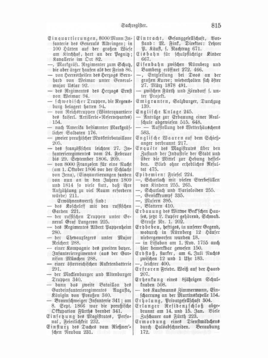 Ermordungder Schreiuerstochter Höf Fab er'sche Sprech masch ine 441. ler durch Halsabschneiden 276. Fahnen des Bürgermilitärs werden — der Viehhändlerswittwe Wurzmann in der Kirche geweiht 215. 278. — , auf dem Markt ausgesteckt 203. — , Georg Ermann, geisteskranker Kell— der freiwilligen Stadtwehr geweiht 282. ner, aus dem Irrenhaus entlassen, ermordet Bruder und Mutter, zu — des ehemaligen Freikorps dem Turn verein überlassen 466. 485. letzt sich selbst 298. Ernte, reichgesegnete vom Jahre 1817. — der ehemaligen Feuerwehr an die frei Erntefest am 18. Juli 228. willige Feuerwehr übergegangen 466. Ersatzgeschäft, schlimmes Resultat Fall Haus, mußte stets 40 Hunde für die markgräfliche Schweinehetze hal 419. 402. 509. Erschlagen, W. durch seinen Bru ten 148. der 557. Fallwerke, vom Gewerbverein ein geführt 275. Erschossen, ein Handlungsreisender Fechtbund, Entstehung 323. (Selbstmord) .5. Dez. 1886. 665. — , KreiSrath Trautmann (Selbstmord) Feier der Völkerschlacht bei Leipzig 224; fortwährend bis 1848 aus dem Mi 282. chaelskirchhof abgehnlten; bis zum — Konrad Kübler, von Raubmördern Jahr 1860, wo sie auf der Haard be 365. gangen wurde 315. 327. Erstickung einer Familie durch Koh — des Einzugs der Verbündeten in lendampf 212. 335. 380. Paris, Salven der damals hier ein Erstochen, Polizeisoldat Schildknecht quartierten russischen Artillerie 223. 286. — des 50jährigen Erinnerungsfestes — , Metzgermeister Müller im Streit der Besitznahme Fürths durch die 340. Krone Bayern 304. — , Schreinergeselle Andreas Gerber — des Friedensschlusses mit Frankreich 345. 389. — , Jordan durch Sophie Ott 366. — des Sedanfestes, s. Sedan. — , Arbeiter Mich. Bauer 486. Felddiakone, s. Diakone. — , Schreiner Kellermann 497. Feldschlößchen, Begründung 396. — , Drechslergeselle Hermann 505. — , Eröffnung 403. — , Babette Walch 510. Feldspiegelmacher, erster, in Fürth Erträgnisse des domprobsteilichen 138. Amtes iu Fürth 39. 184. Felleisen eines Handwerksburschen Export Fürths nach den Bereinigten aus Vorsicht wegen Verhütung der Staaten von Nordamerika für die Pestansteckung verbrannt 125. Monate Juli bis September 1878. Ferienkolonien für Kinder 568. 499. 603. 634. — Nürnbergs vom 1. Oktober 1884 — , Modifikation derselben 623. bis 30. September 1885. 641. Festlichkeiten wegen Vermählung Extinktörapparat auf dem Schieß des Kronprinzen Maximilian 268. anger probirt worden 354. — bei der Feier der goldenen Hochzeit — deSgl. hinter dem Gaswerk 474. des Kaiserpaares 511. 565. Feuerlöschordnung, neue 428. Exzeß am Sylvesterabend 1843 wegen des Gebotes um 11 Uhr Abend die Feuerlöschprobe mit dem Anihilator 565. Wirthshäuser zu schließen 271. — oder Bierkrawall wegen hoher Bier Feuerspritze, angeschafft aus den Verpflegungsgeldern der russischen preise am 3. Mai 1866. 338. Truppen 233. — Kosten für die Bürgerschaft 345. — , bedeutender am Kirchweihmontag — angeschafft in Folge eines Gewin nes von einem gezogenen Staats 30. Sept. 1872, Bestürmung des papier 237. Rathhauses, Militärhilfe 407. — Kosten für die Bürgerschaft 415. Feuerwächter auf den RathhauS— Schwurgerichtsurtheil 416. thurm bestellt 305.