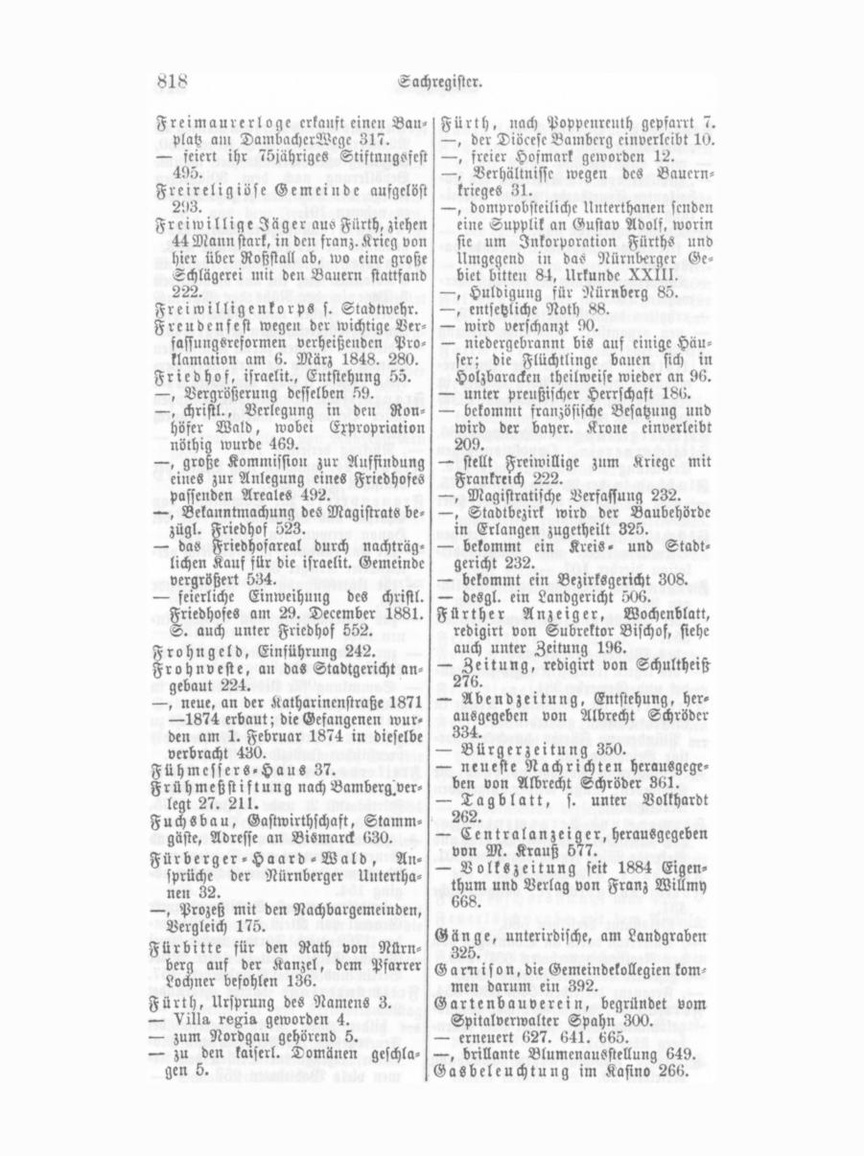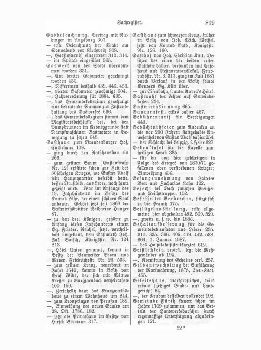 Gasbeleuchtung, Vertrag mit Rie dinger in Augsburg 307. — erste Beleuchtung der Stadt am Sonnabend vor Kirchweih 308. —, Gasfinsterniß eingetreten 312. 314. — im Spitale eingeführt 365. Gaswerk von der Stadt übernom men worden 331. —, Ein dritter Gasometer genehmigt worden 430. —, Differenzen deshalb 439. 446. 453. —, vierter Gasometer genehmigt 604. —, IahreSrechnung für 1884. 635. —, das Gemeindekollegium genehmigt eine bedeutende Summe zur Instand haltung des Gaswerkes 636. —, das Gemeindekollegium stimmt dem Magistratsbeschlusse bei, bei den Pumpbrunnen im Rednitzgrunde statt Dampfmaschinen GaSmotore in Be wegung zu setzen 648. Gasthaus zum Brandenburger Hof, Entstehung 109. — ging durch den Rathhausbau ein 266. — zum grünen Baum (Gustavstraße Nr. 12) existirte schon zur Zeit des 30jährigen Krieges, wo Gustav Adolf sein Hauptquartier daselbst hatte, dessen Brustbild, aus Leder, noch heute gezeigt wird. War im Anfänge des 19. Jahrhunderts im Besitze des Konrad Löhe, der einen schönen Saal anbaute. Gehört jetzt seit 1868 der Gastwirthswittwe Katharine Hunger 87. — zu den drei Königen, gehörte zu Anfang dieses Jahrhunderts einem Gg. Frieder. Reichel, jetzt, Vortheil haft umgebaut, dem Gastwirth Joh. Jak. Borsch, KönigSstr. Nr. 124 213. —, Hotel Union genannt, kommt in Besitz der Baumeister Evora und Meyer, FriedrichSstr. Nr. 23. 533. — zum grünen Kranz, neuerbaut im Jahre 1649, kommt in Besitz von Graf Widt, der sich mit Wittwe Kreffer zu Burgsarnbach verheiratete 100. 150. —, Zertahelly baut das Kranzwirthshaus zu einem Wohnhaus um 244. — zum Kronprinzen von Preußen 182. —, Einweihung des neuen Saales am 28. Okt. 1786. 182. — jetzt als Privathaus im Besitze von Hirsch Bermann 317.
