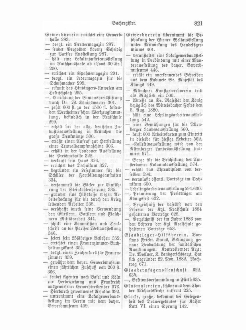 Gewerbverein errichtet eine Gewerb- Gewerbverein übernimmt die Be halle 283. schickung der Wiener Weltausstellung — desgl. ein Brettermagazin 287. unter Mitwirkung des HandelSgre— sendet Vergolder Lorenz Scheidig miumS 401. zur Pariser Ausstellung 287. — veranstaltet eine LokalgewerbauSstel— hält eine Lokalindustrieausstellung lung in Verbindung mtt einer Wan im Rathhaussaale ab (Loos 30 Kr.) derausstellung des bayer. Gewerb2W. museums 446. — errichtet ein Spähnemagazin 291. — erhält ein anerkennendes Schreiben — deSgl. ein Ledermagazin für die aus dem Kabinete Se. Majestät des Schuhmacher 295. Königs 449. — erkauft das Hindingers-Anwesen am — Münchner Kunstgewerbverein tritt Hektischplatz 295. — , Errichtung der SimonSpreisstistung als Mitglied ein 500. — Adresse an Se. Majestät den König durch Or. W. Königswarter 301. bezüglich des Wittelsbacher Festes den — zahlt 600 fl. zu der 1500 fl. kosten 5. Äug. 1880. den Wertheimer'schen Werkzeugsamm — hält eine Lehrlingsarbeitenausstel lung, befindlich in der Realschule lung 542. 299. — erhält bei der allg. deutschen In — seine Bemühungen für die Nürn berger Laudesausstellung 560. dustrieausstellung in München die — kauft 600 Arbeitskarten zum Eintritt große Denkmünze 300. in dieselbe für hiesige Arbeiter 562. — erläßt einen Aufruf zur Herstellung — -Kollektivausstellung wird von der einer Centraldampfmaschine 306. Nürnberger Landesausstellung Prä— erhält in der Londoner Ausstellung miirt 571. die Preismedaille 322. — Sorge für die Beschickung der Am — verkauft sein Haus 326. sterdamer Kolonialausstellung 574. — errichtet das Technikum 327. — begründet ein Lesezimmer für die — erhält das Ehrendiplom von der selben 594. Schüler der Fortbildungsanstalten — veranlaßt öffentl. Vorträge im Tech 334. nikum 600. — versammelt die Bäcker zur Einfüh — Lehrlingsarbeitenausstellung 594.630. rung der Eteinkohlenheizung 335. — gründet eine Hilsskasse wegen Ar —, Prämiirung der Preisträger am Königsfest 632. beitsstockung für die durch den Krieg leidenden Arbeiter 338. —, Verzeichniß der daselbst von den — verschafft durch seine Verwendung Lehrern der Kgl. Realschule 1884 den Gürtlern, Sattlern und Flasch gehaltenen Vorträge 628. nern Militärarbeit 344. —, Verzeichniß der im Jahre 1886 von — schickt eine Kommission und Denk den Lehrern der Kgl. Realschule ge schrift an die Pariser Weltausstellung haltenen Vorträge 653. 346. GlaSbeleger-Hilfsverein, Vor — feiert sein 25jähriges Bestehen 352. stand Friedr. KrauS, Bedingunb ge — errichtet eineu Frauenzimmer-Buchnaue Beobachtung der sanitätlschen haltungSkurS 354. Anordnungen. Kontrolirender Arzt: — desgl. eiuen Zeichenkurs für Frauen Dr. Wollner, K. Landgerichtsarzt. Hat zimmer 359. sich gegründet 22. Nov. 1882. Nach — gewährt dem bayer. Gewerbmuseum trag 671. einen jährlichen Zuschuß von 200 fl. Glasberufsgenossenschaft 622. 366. 635. — sendet Agenten nach Basel und Köln zur Herbeiziehnng aus Frankreich —, Sektionsversammlung in Fürth 635. ausgewiesener Gewerbtreibender 376. Glasmalereien, schöne aus dem Chor der Michaelskirche entfernt 225. — Hierdurch gewonnenes Resultat 392. — unternimmt eine LokalgewerbauS- Glocke, große, bekommt bei Gelegen ftelluug im Verein mit dem bayer. heit des Trauergeläutes für Kaiser Gewerbmuseum 409. Karl VI. einen Sprung 142.