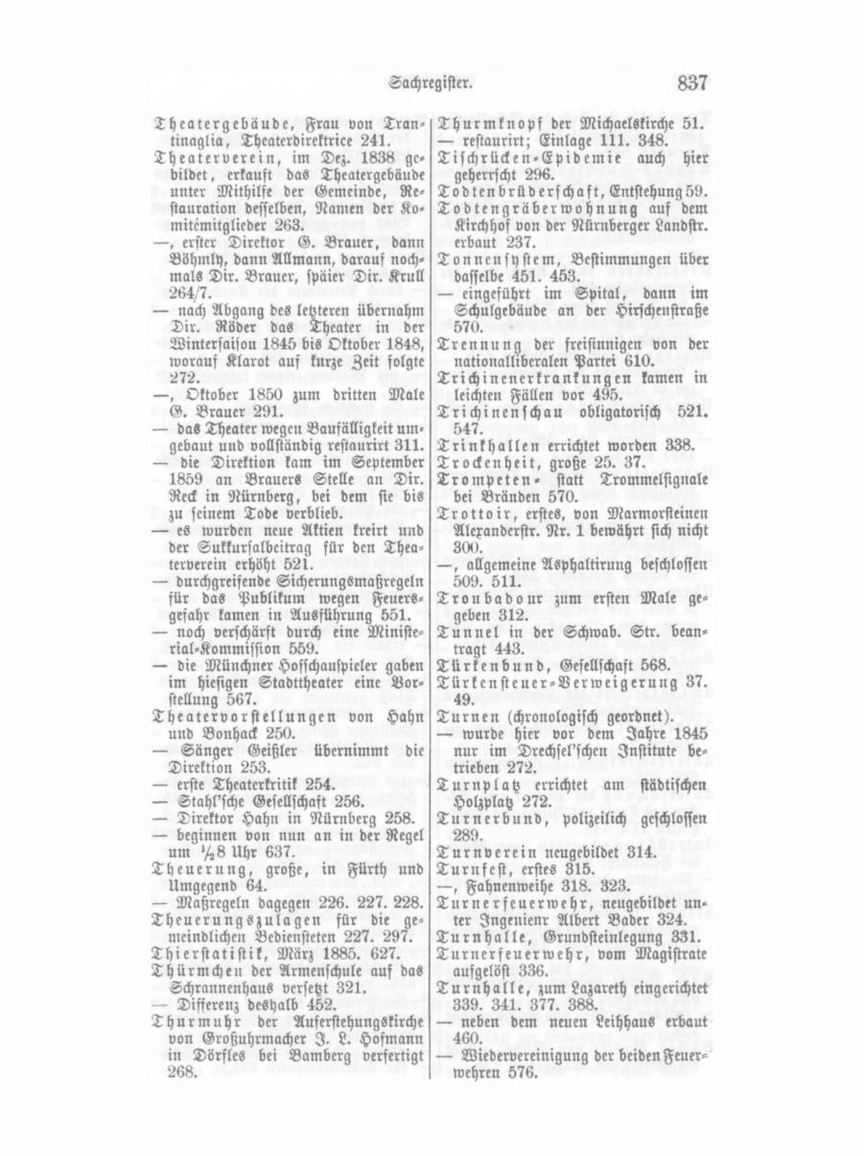 Turnhalle im Hofe des Schulhauses Verbot, erneutes, die Leichen vor in der Ottostraße 582. der Bestattung in der Kirche auszu Turnfest 589. setzen 203. Typhus-Durchseuchung des Hau — der mit giftigen Farben bestrichenen ses Nr. 21 der Alexanderstraße 343. Kinderspielwaaren 544. Typhus-Epidemie in der Rednitz — verkäufliche Nahrungsmittel ans straße mit 57 Erkrankungen, 1874, Blut von geschächteten Thieren zu bereiten 562. Detailstatistik. Verbrannt in der Maischkuse 174. Ueberfahren durch einen Zug der — deSgl. 309. Ludwigsbahn 409. — durch Petroleum der Knabe Wun — bei Rettung eines Kindes 663. der 423. — mit Abtrennung des Kopfes; Staats Verein (chronologisch geordnet). eisenbahn 661. — zur Unterstützung in Krankheits Nebergang zum Marksystem 455. und Sterbefällen 237. — Umwechslung der bisherigen Mün — zur Bildung einer Lesegesellschaft 237. zen in Reichsgeld 472. Ueberschwemmungen der Pegnitz — für kirchliche Musik 269. 141. 148. 286. — zur Besserung entlassener Sträf — der Redmtz 240. 420. 474. 488. linge 273. 1877 den 16. Mai. — zur Erzielung billiger Holzpreise 274. Uebungslager zwischen Fürth und Nürnberg unter Marschall Wrede — für prunklose Beerdigung 284. 240. — für Pflege der Gärten 297. — desgl. unter Prinz Eduard von Al — für GabelSberger'sche Stenographie tenburg 265. 310. Uhrmacher bilden mit den Schlossern — von Frauen und Jungfrauen zur ein eigenes Handwerk 148. Beschaffung von Verbandsmitteln für Uhrmacherei war besonders entwickelt die österreichische Armee 312. zu Ende des vorigen Jahrhundert- — zur Unterstützung in Fällen von unter dem Uhrmacher Joh. Jak. Geisteskrankheiten 315. 318. Großer und dessen Söhnen 275. — erhält ein Geschenk von 500 M. 604. Umlagen, städtische, werden einge führt 337. — zur Herstellung billiger Wohnungen Umlagepflicht des EisenbahnärareS 319. nicht anerkannt 472. — zur Unterstützung der SchleSwigHolsteiner 328. Universität, israelitische, wird ge gründet 57. — zur Schadloshaltung der Geschwor Unterrichtskurs, s. Frauenzimmer nen 343. — zur Unterstützung nothleidender Ar 636. 653. Untersuchung der Papiere und Bü beiter und Gewerbtreibender 375. 392. cher des KaalS auf Befehl des Mark grafen 115. 144. — von Frauen und Jungfrauen zur Unterstützung und Pflege der Ver Unterstützungsverein zum Besten der Feuerwehr 289. wundeten 375. 383. — für durch den Krieg nothleidende — , ärztl., zum ärztlichen Dienste bei den Verwundeten 375. Personen 375. 392. Urtheil, ungünstiges, des Reichshof — , socialdemokratischer, Bildung dessel rathes für den Markgrafen (sogenann ben 405. — , antisocialistischer, Entstehung 497. ter Exekutionsprozeß) 127. — , VerschönerungSverein, Entstehung Bach, Gefecht zwischen Oesterreicheru 512. — für öffentliche Vorträge 513. und Franzosen 202. — zwischen Preußen und ReichStruppen — zur Unterstütznng hiesiger Nothlei 152. dender 517. 520. 522. Bacher Brücke von Stein, erbaut — , lnther., für weibliche Diakonie 585. — für Arbeiterkolonien 633. auf Befehl des Markgrafen 156.
