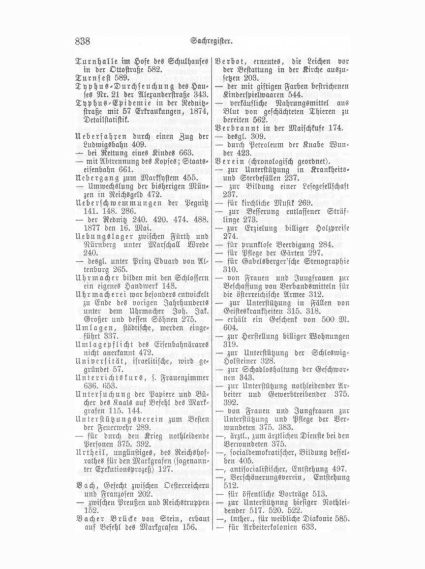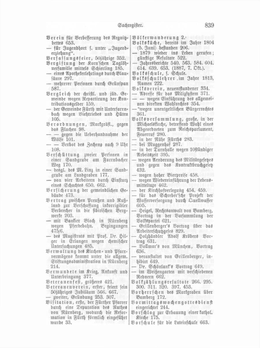 Verein für Verbesserung des Regnitzbettes 653. — für Jugendhort s. unter „Jugend erziehung". Verfassungsfeier, 50jährige 352. Vergiftung der Korn'schen Taglöhuerfamilie mittels Schierling 185. — eines Apothekerlehrlings durch Blau säure 297. — mehrerer Personen durch Grünspan 587. Vergleich der christl. und jüd. Ge meinde wegen Repartirung der Kon tributionsgelder 159. — der Gemeinde Fürth mit Unterfarrn bach wegen Viehtriebes und Hüten 105. Verordnungen, Markgräfl., gegen das Fluchen 98.
