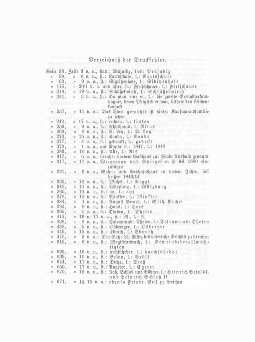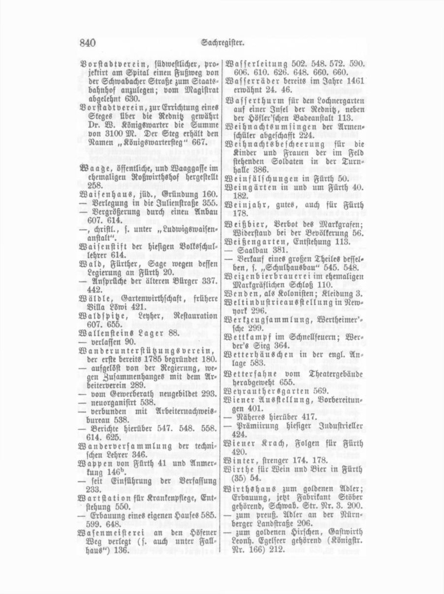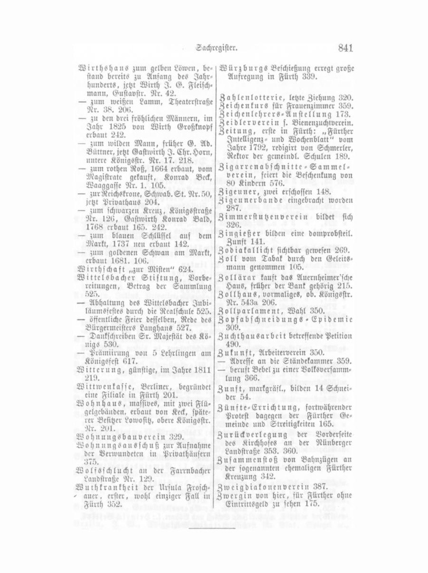 Wirthshaus zum gelbeu Löwen, be staub bereits zu Anfang des Jahr hunderts, jetzt Wirth I. G. Fleisch mann, Gustavstr. Nr. 42. — zum weißen Lamm, Theaterstraße Nr. 38. 201). — zu den drei fröhlichen Männern, im Jahr 1825 von Wirth Großknopf erbaut 242. — zum wilden Mann, früher G. Ad. Büttner, jetzt Gastwirth I. Chr. Horn, untere Königsstr. Nr. 17. 218. — zum rotheu Roß, 1664 erbaut, vom Magistrate gekauft, Konrad Beck, Waaggasse Nr. 1. 105. — zur Reichskrone, Schwab. St. Nr. 50, jetzt Privathaus 204. — zum schwarzen Kreuz, Köuigsstraße Nr. 126, Gastwirth Konrad Bald, 1768 erbaut 165. 242. — zum blauen Schlüssel aus dem Markt, 1737 ueu erbaut 142. — zum goldenen Schwan am Markt, erbaut 1681. 106. Wirthschaft „zur Misten" 624. Wittels bacher Stiftung, Vorbe reitungen, Betrag der Sammlung 525. — Abhaltung des Wittelsbacher JubiläumSfestes durch die Realschule 525. — öffentliche Feier desselben, Rede des Bürgermeisters Langhaus 527. — Dankschreiben Sr. Majestät des Kö nigs 530. — Prümiirung von 5 Lehrlingen am Königsfest 617. Witterung, günstige, im Jahre 1811 219. Wittwenkasse, Berliner, begründet eine Filiale in Fürth 201. Wohnhaus, massives, mit zwei Flü gelgebäuden, erbaut von Keck, späte rer Besitzer Lowositz, obere Königöstr. Nr. 201. W o h n u n g S b auve r e in 329. Wohnun g S a u s s ch u ß zur Aufnahme der Verwundeten in Privathäusern 375. Wolfsschlucht au der Farrnbacher Landstraße Nr. 129. Wulhkrankhcit der Ursula Froschauer, erster, wohl einziger Fall in Fürth 35)2.
