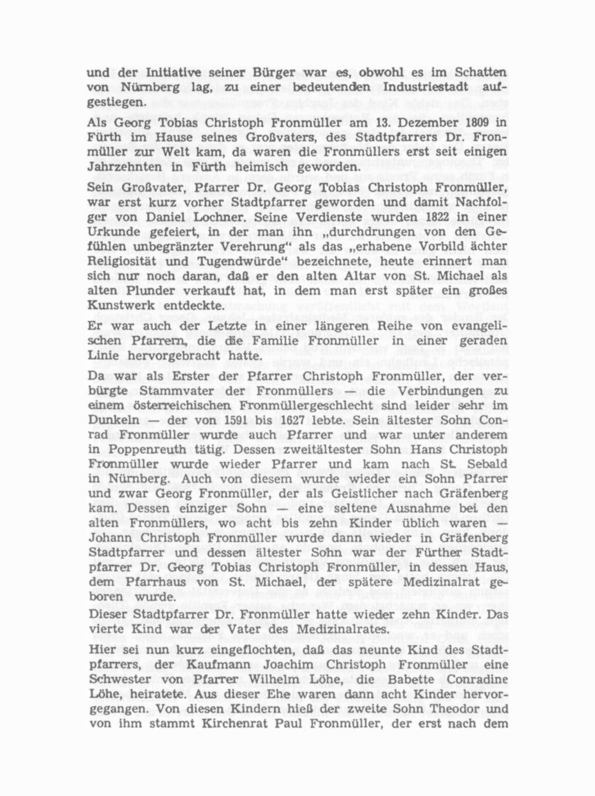 Er war auch der Letzte in einer längeren Reihe von evangeli schen Pfarrern, die die Familie Fronmüller in einer geraden Linie hervorgebracht hatte. Da war als Erster der Pfarrer Christoph Fronmüller, der ver bürgte Stammvater der Fronmüllers — die Verbindungen zu einem österreichischen Fronmüllergeschlecht sind leider sehr im Dunkeln — der von 1591 bis 1627 lebte. Sein ältester Sohn Con rad Fronmüller wurde auch Pfarrer und war unter anderem in Poppenreuth tätig. Dessen zweitältester Sohn Hans Christoph Fronmüller wurde wieder Pfarrer und kam nach St Sebald in Nürnberg. Auch von diesem wurde wieder ein Sohn Pfarrer und zwar Georg Fronmüller, der als Geistlicher nach Gräfenberg kam. Dessen einziger Sohn — eine seltene Ausnahme bei den alten Fronmüllers, wo acht bis zehn Kinder üblich waren — Johann Christoph Fronmüller wurde dann wieder in Gräfenberg Stadtpfarrer und dessen ältester Sohn war der Fürther Stadtpfarrer Dr. Georg Tobias Christoph Fronmüller, in dessen Haus, dem Pfarrhaus von St. Michael, der spätere Medizinalrat ge boren wurde. Dieser Stadtpfarrer Dr. Fronmüller hatte wieder zehn Kinder. Das vierte Kind war der Vater des Medizinalrates.