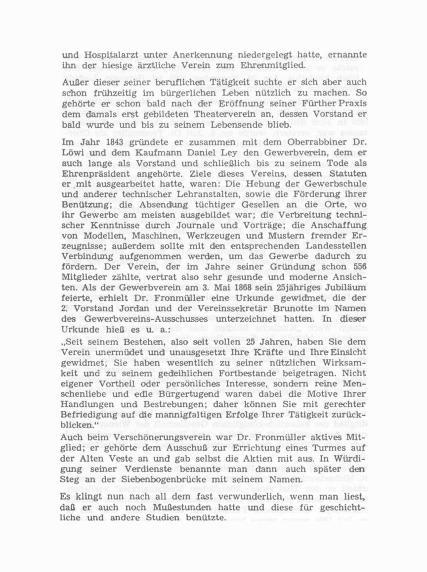 Außer dieser seiner beruflichen Tätigkeit suchte er sich aber auch schon frühzeitig im bürgerlichen Leben nützlich zu machen. So gehörte er schon bald nach der Eröffnung seiner Fürther Praxis dem damals erst gebildeten Theaterverein an, dessen Vorstand er bald wurde und bis zu seinem Lebensende blieb. Im Jahr 1843 gründete er zusammen mit dem Oberrabbiner Dr. Löwi und dem Kaufmann Daniel Ley den Gewerbverein, dem er auch lange als Vorstand und schließlich bis zu seinem Tode als Ehrenpräsident angehörte. Ziele dieses Vereins, dessen Statuten er mit ausgearbeitet hatte, waren: Die Hebung der Gewerbschule und anderer technischer Lehranstalten, sowie die Förderung ihrer Benützung; die Absendung tüchtiger Gesellen an die Orte, wo ihr Gewerbe am meisten ausgebildet war; die Verbreitung techni scher Kenntnisse durch Journale und Vorträge; die Anschaffung von Modellen, Maschinen, Werkzeugen und Mustern fremder Er zeugnisse; außerdem sollte mit den entsprechenden Landesstellen Verbindung ausgenommen werden, um das Gewerbe dadurch zu fördern. Der Verein, der im Jahre seiner Gründung schon 556 Mitglieder zählte, vertrat also sehr gesunde und moderne Ansich ten. Als der Gewerbverein am 3. Mai 1868 sein 25jähriges Jubiläum feierte, erhielt Dr. Fronmüller eine Urkunde gewidmet, die der 2. Vorstand Jordan und der Vereinssekretär Brunotte im Namen des Gewerbvereins-Ausschusses unterzeichnet hatten. In dieser Urkunde hieß es u. a.: „Seit seinem Bestehen, also seit vollen 25 Jahren, haben Sie dem Verein unermüdet undi unausgesetzt Ihre Kräfte und Ihre Einsicht gewidmet; Sie haben wesentlich zu seiner nützlichen Wirksam keit und zu seinem gedeihlichen Fortbestände beigetragen. Nicht eigener Vortheil oder persönliches Interesse, sondern reine Men schenliebe und edle Bürgertugend waren dabei die Motive Ihrer Handlungen und Bestrebungen; daher können Sie mit gerechter Befriedigung auf die mannigfaltigen Erfolge Ihrer Tätigkeit zurück blicken.“ Auch beim Verschönerungsverein war Dr. Fronmüller aktives Mit glied; er gehörte dem Ausschuß zur Errichtung eines Turmes auf der Alten Veste an und gab selbst die Aktien mit aus. In Würdi gung seiner Verdienste benannte man dann auch später den Steg an der Siebenbogenbrücke mit seinem Namen.