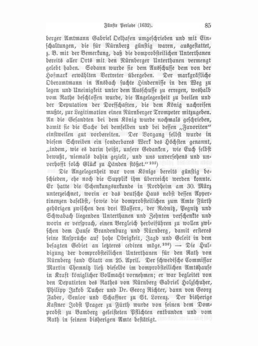 schaltungen, die für Nürnberg günstig waren, ausgestattet, z. B. mit der Bemerkung, daß die domprobsteilichen Unterthanen bereits aller Orts mit den Nürnberger Unterthanen vermengt gelebt haben. Sodann wurde sie dem Ausschüsse dem von der Hofmark erwählten Vertreter übergeben. Der markgräfliche Oberamtmann in Ansbach suchte Hindernisse in den Weg zu legen und Uneinigkeit unter dem Ausschüsse zu erregen, weshalb vom Rathe beschlossen wurde, die Angelegenheit zu beeilen und der Deputation der Dorfschaften, die dem König nachreisen mußte, zur Legitimation einen Nürnberger Trompeter mitzugeben. An die Gesandten bei dem König wurde nochmals geschrieben, damit sie die Sache bei demselben und bei dessen „Favoriten" einstweilen gut vorbereiten. Der Vorgang selbst wurde in diesem Schreiben ein sonderbares Werk des Höchsten genannt, „indem, wie es darin heißt, unsere Gedanken, wie Euch selbst bewußt, niemals dahin gezielt, und uns unversehens und un verhofft solch Glück zu Händen stößet/"") Die Angelegenheit war vom Könige bereits günstig beschieden, ehe noch die Supplik ihm überreicht werden konnte. Er hatte die Schenkungsurkunde in Nordheim am 30. März unterzeichnet, worin er das deutsche Haus nebst dessen Appertinenzen daselbst, sowie die domprobsteilichen zum Amte Fürth gehörigen zwischen den drei Wassern, der Rednitz, Pegnitz und Schwabach liegenden Unterthanen und Zehnten verschenkte und worin er versprach, einen Vergleich herbeiführen zu wollen zwi schen dem Hause Brandenburg und Nürnberg, damit ersteres seine Ansprüche auf hohe Obrigkeit, Jagd und Geleit in dem besagten Gebiet an letzteres cediren möge."°) — Die Hul digung der domprobsteilichen Unterthanen für den Rath von Nürnberg fand Statt am 25. April. Der schwedische Commissar Martin Chemnitz ließ dieselbe im domprobsteilichen Amtshause in Kraft königlicher Vollmacht vornehmen; er war begleitet von den Deputirten des Rathes von Nürnberg Gabriel Holzschuher, Philipp Jakob Tücher und vr. Georg Richter, dann von Georg Faber, Senior und Schaffner zu St. Lorenz. Der bisherige Kastner Jobst Prager zu Fürth wurde von seinen dem Dom probst zu Bamberg geleisteten Pflichten entbunden und vom Rath in seinem bisherigen Amte bestätigt.