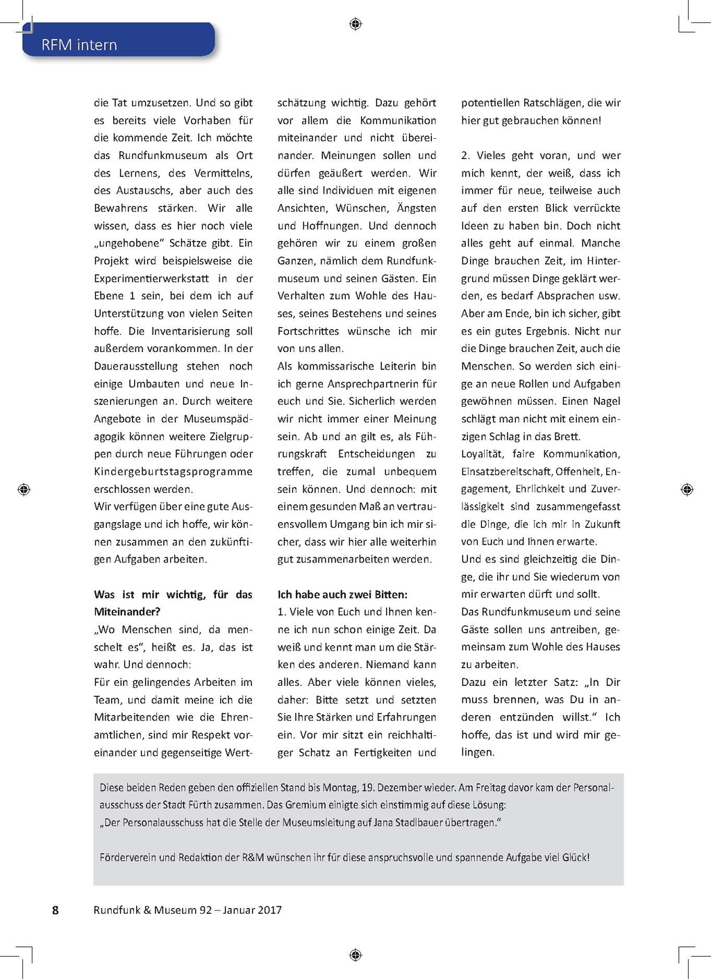 schätzung wichtig. Dazu gehört vor allem die Kommunikation miteinander und nicht übereinander. Meinungen sollen und dürfen geäußert werden. Wir alle sind Individuen mit eigenen Ansichten, Wünschen, Ängsten und Hoffnungen. Und dennoch gehören wir zu einem großen Ganzen,nämlichdemRundfunkmuseumundseinenGästen.Ein Verhalten zum Wohle des Hauses,seinesBestehensundseines Fortschrittes wünsche ich mir vonunsallen. Als kommissarische Leiterin bin ich gerne Ansprechpartnerin für euch und Sie. Sicherlich werden wir nicht immer einer Meinung sein. Ab und an gilt es, als Führungskraft Entscheidungen zu treffen, die zumal unbequem sein können. Und dennoch: mit einemgesundenMaßanvertrauensvollemUmgangbinichmirsicher,dasswirhieralleweiterhin gutzusammenarbeitenwerden.